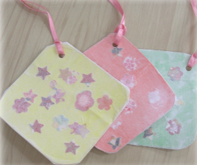 持ち帰り作品作り「コースターの飾り」です。台紙に飾りを貼り付け、半紙で覆い、柔らかな感じの吊し飾りになります。