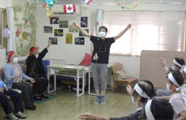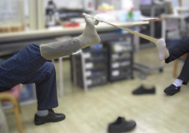 相手の足から早くストッキングを脱がした方の勝ちになる「ストッキング争奪戦」足だけの戦いです。そのあとおやつにする「パンつかみ競争」椅子から立ち上がりパンに向かって早足で行ってマジックハンドでつかみます。おやつになるので、「取らないとおやつなしかな?頑張るわ」と真剣に慎重にマジックハンドを繰り出しておられました。