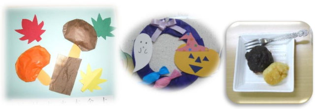 きのこのカレンダーやハロウィンの壁飾り作りました。おはぎも手作りして楽しみました。